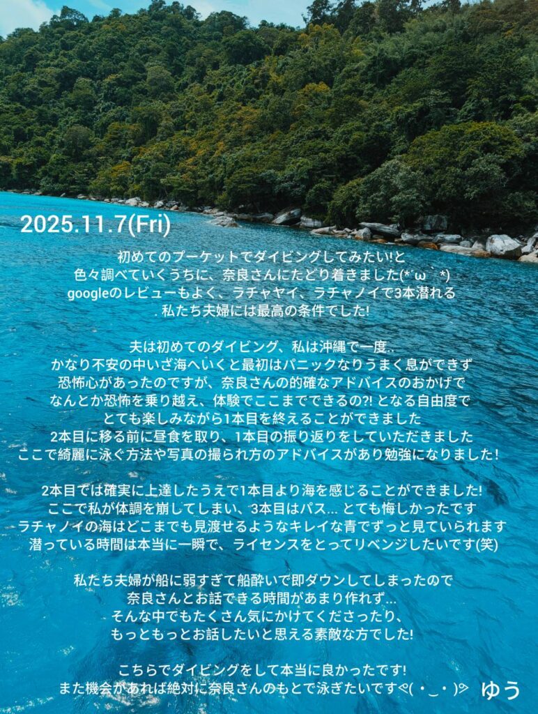 初めてのプーケットでダイビングしてみたい!と色々調べていくうちに、奈良さんにたどり着きました(´ω`) googleのレビューもよく、ラチャヤイ、ラチャノイで3本潜れる私たち夫婦には最高の条件でした!