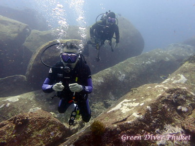 島の少し外れのロープから潜降をして、水深10m程度には巨岩が広がっています。